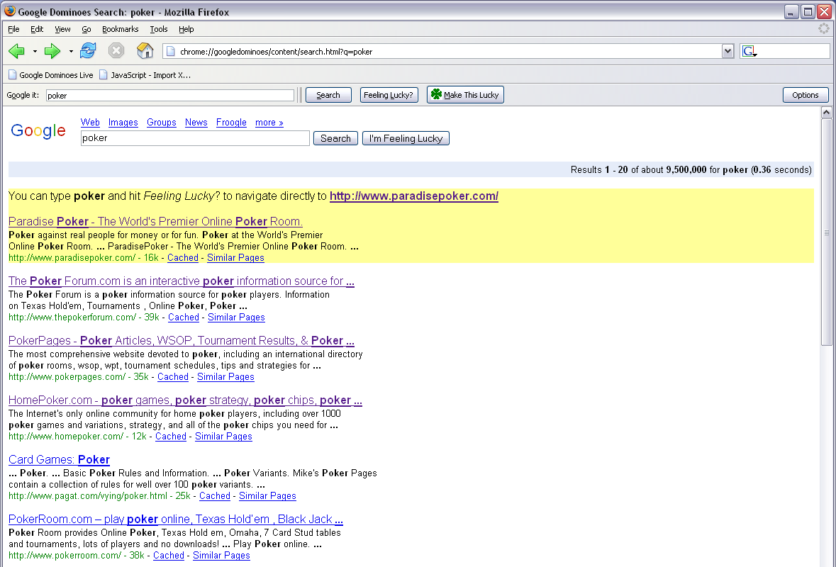 This is a Google Dominoes search for poker. The sites in the search results that the user has previously visited appear at the top of the list, making it easier to find pages previously visited. The first result is highlighted with instructions about how to return to it more quickly by using the Feeling Lucky? button.